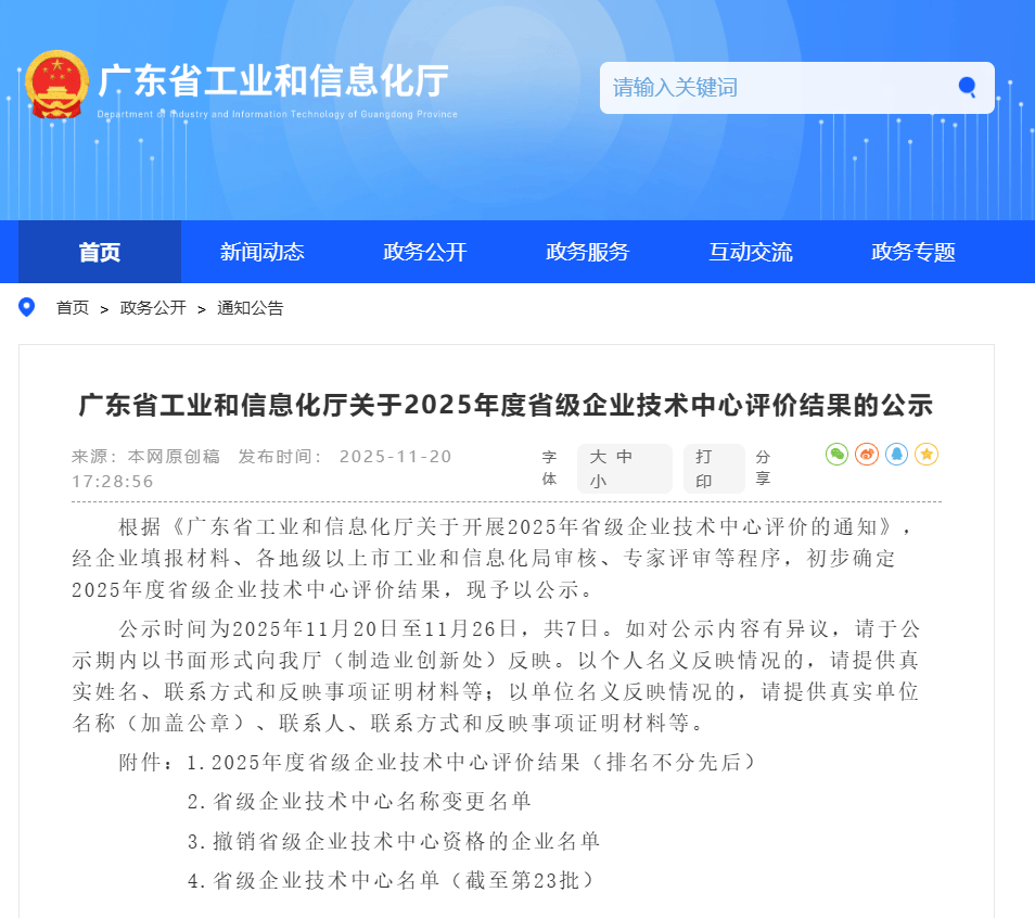 近日,2025年11月29日,正在2025年度省级企业手艺核心评价成果的公示中,