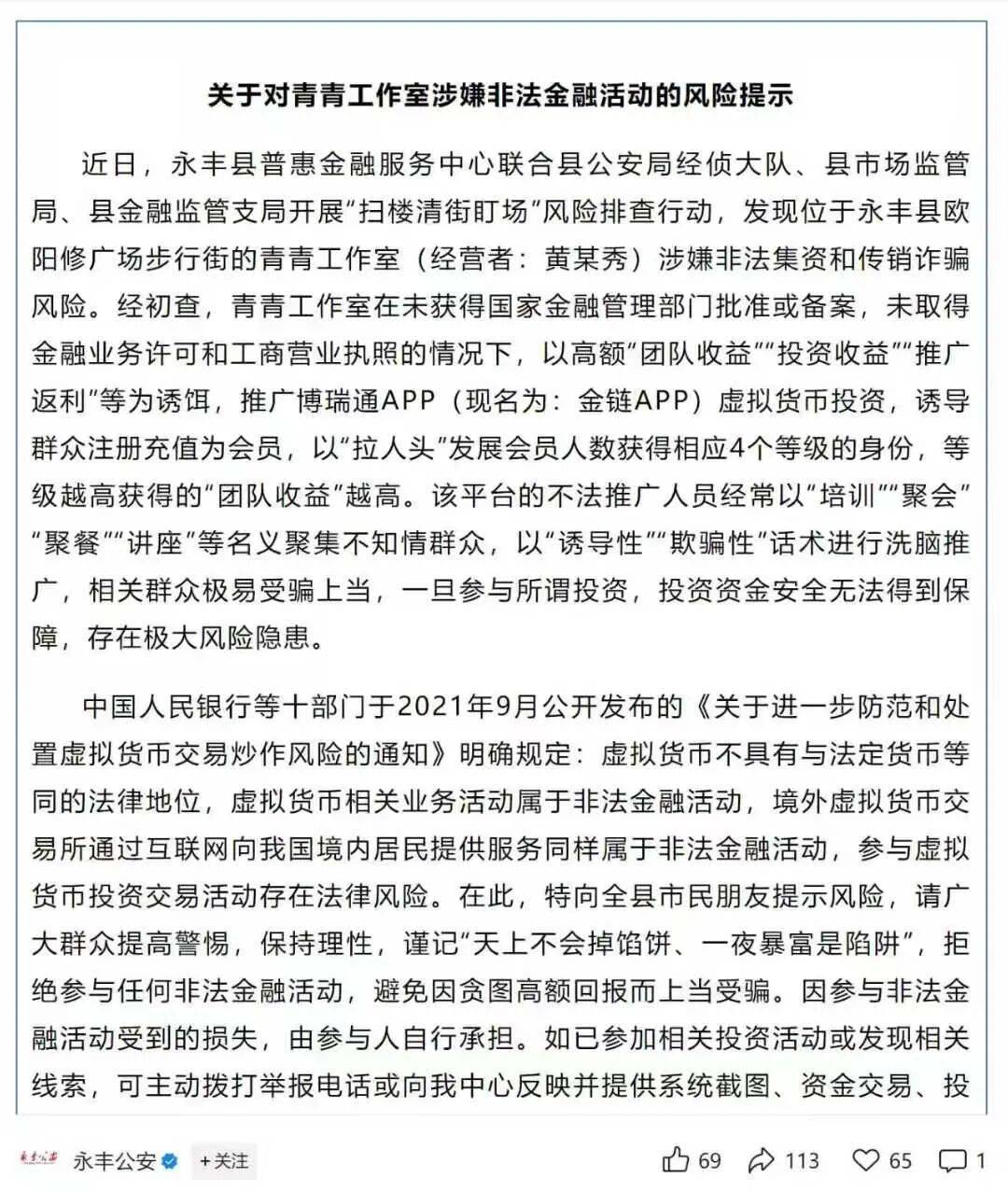 忽悠会员采办梯度配套,同时以津贴、家电等励刺激拉人头。实则编织了一个个“伐鼓传花”的金融圈套。一些细心包拆的收集投资平台屡次呈现“闪崩”、数据清空和无法提现的情况,虽然平台暗示一个月背工续费会降至10%,果不其然,我们还发觉“卡贝本钱”的IP取别的几个我们曾多次提及且同样风险极高的股票跟投项目一模一样。声称可领取5万余元,昨日当晚就有大量参取者反馈,提现手续费却高达70%!每月设定业绩查核要求,号称用户可通过运做APD通证私募取算力挖矿获得收益。不达标便会降级,许诺升值。平台违规刊行“MEC”代币,及时止损尽快报案才是最无效的止损体例!